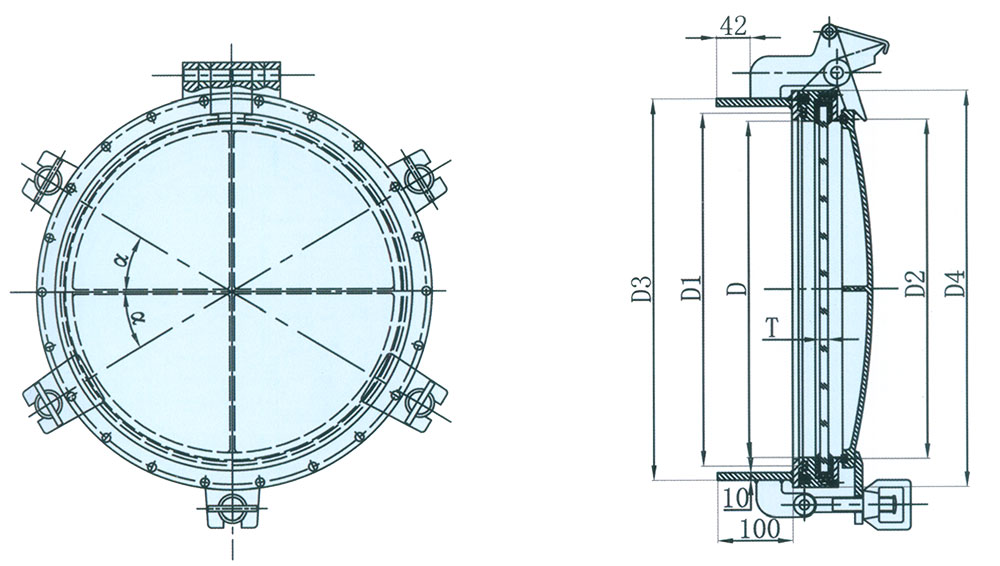 | 透光尺寸D | D1 | D2 | D3 | D4 | α | fasteners qty | Tglass thickness | opening size of bulkhead | bolt qty | |