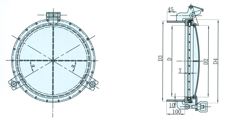 | 光尺寸D | D1 | D2 | D3 | D4 | α | 紧固件数量 | 玻璃厚度T | 围壁开口尺寸 | 螺栓数量 | |